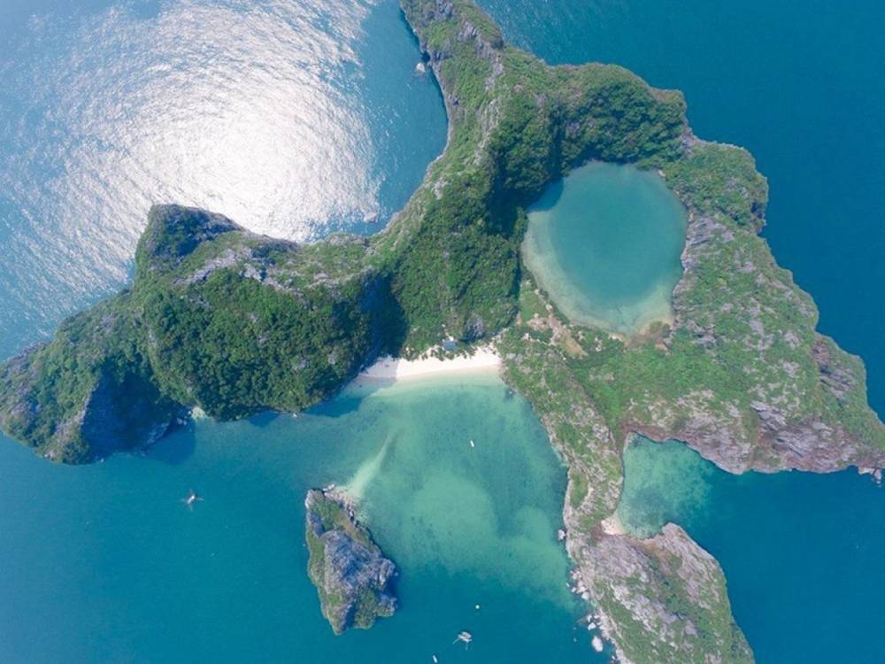 Màu nước trong xanh như ngọc bích của “đôi mắt rồng” này giúp hòn đảo nổi bật hơn hẳn so với phần còn lại của vịnh Hạ Long.